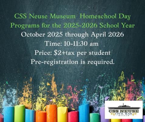 Join us for CSS Neuse Museum Homeschool Day programs for the 2025-2026 school year! After everyone has registered, our team will assign each student to a group for the field trip. Please ensure that you include the Co-op or group you would like to be with on the registration form. You can register for all the homeschool day programs at once or every month.